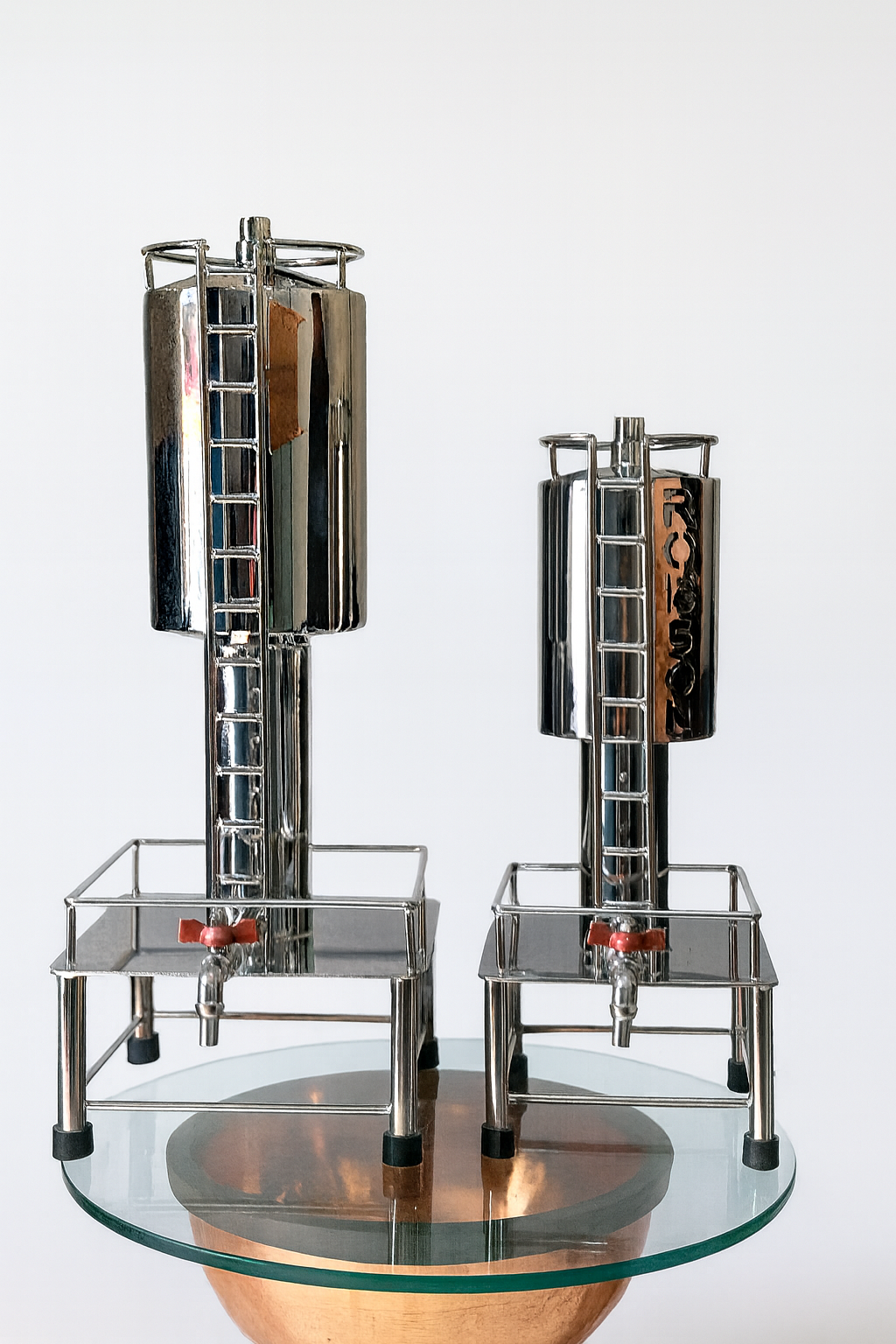 Ambos os modelos acompanham escada metálica decorativa, estrutura soldada profissionalmente e design inspirado em torres industriais reais.